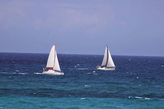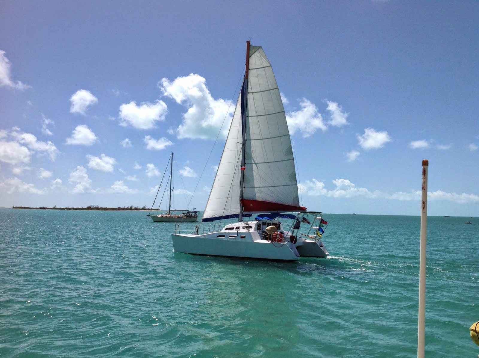 Sailing outside in Exuma sound. Photo shows one of the two mid 40ish monos we passed on this 8 mile upwind leg. Someone told me a PDQ sailed the race a few years ago in these conditions and they "thought the boat might fall apart". We experienced a few slight slaps on the underwing, but nothing that disturbed our forward progress or Abbys test mug of water on the saloon table!